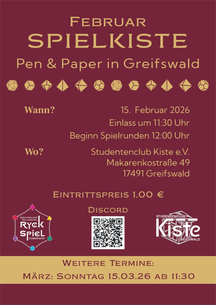 Ein besonderes Highlight steht bevor: Unsere große Convention findet vom 07.11.2025 bis zum 09.11.2025 statt. Wir laden euch herzlich ein, dieses Event mit uns in der Kiste in Greifswald zu erleben.