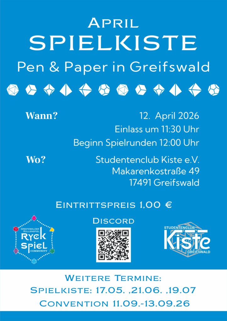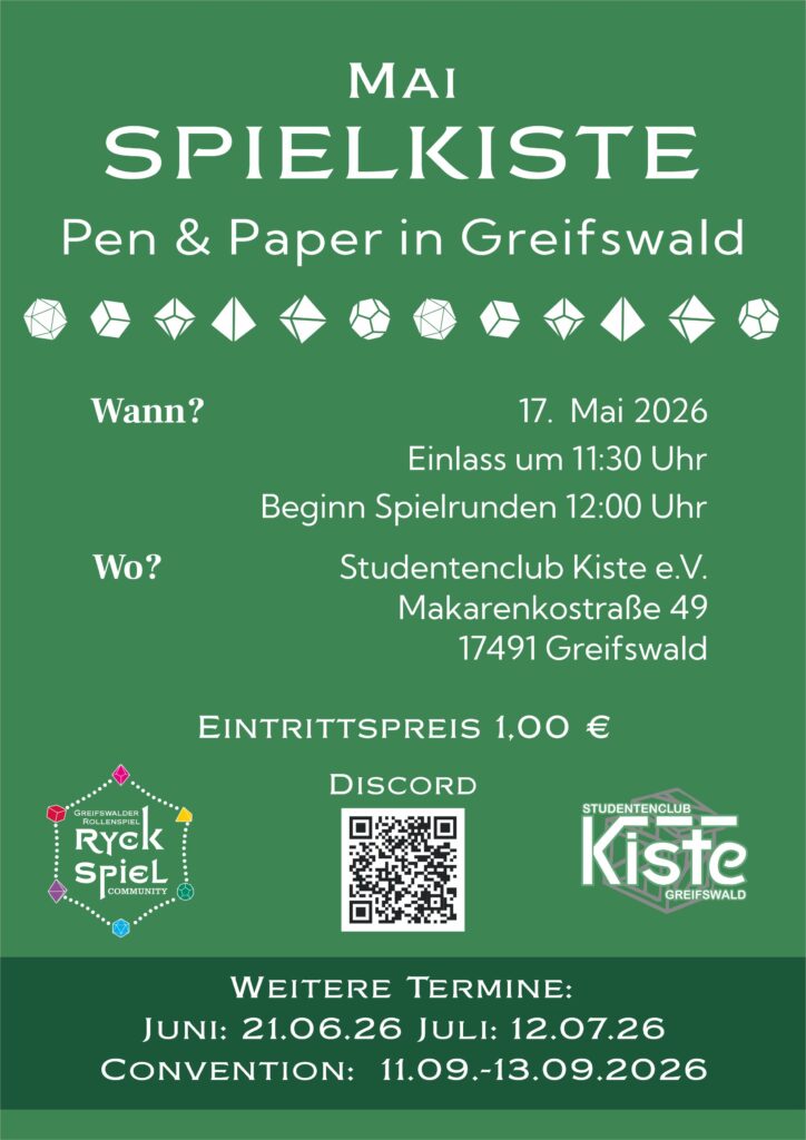 Ein besonderes Highlight steht bevor: Unsere große Convention findet vom 11.09.2026 bis zum 13.09.2026 statt. Wir laden euch herzlich ein, dieses Event mit uns in der Kiste in Greifswald zu erleben.